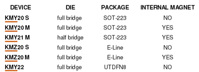 KMZ/KMY根据规格和内部有无磁铁的差异,分别有SOT-223、E-line和UTDFN8三种封装,如下图所示: