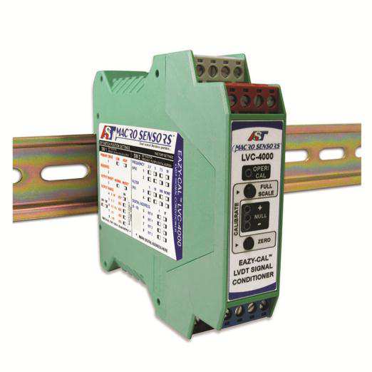 Macro Sensors EAZY-CAL? LVC-4000 是可独立应用的信号调节器,支持各种交流 LVDT、RVDT 和 VR 半桥,同时提供多种电压、电流和数字 RS-485 输出选择。同具有跨度和偏移微调电位的信号调节器相比,按钮校准提供直观操作。 故障状态(如 LVDT/RVDT 连接上的断线)由闪烁的 LED、故障状态错误输出和错误标志电极开路信号表明(请参阅手册了解详细信息)。LVC-4000 在 9-30V 直流电源电压下操作,且封装在聚酰胺 DIN 导轨安装外壳内。为方便起见,校准说明、端子功能、LVDT 连接图表和 DIP 开关功能印在侧板上。若要与其他信号调节器同步,只要使用菊花链连接将其连接至同步总线即可。根据 DIP 开关优先级设置,一个单元将承担主功能。如果出现故障,下一个优先级最高的单元将接替其承担主功能。